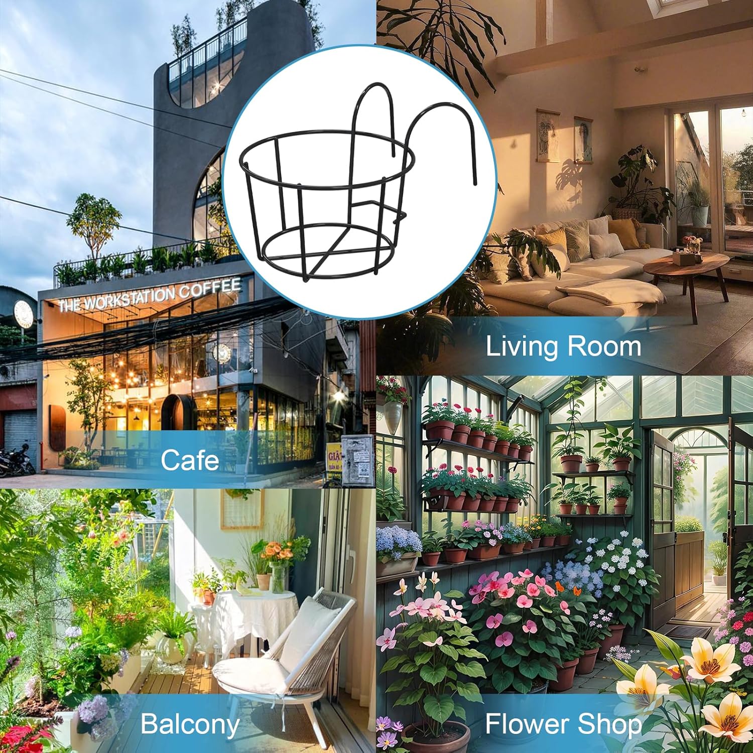 Black Round Metal Hanging Railing Planters, Wire Pot Holder Plants Hangers Black Potted Stand